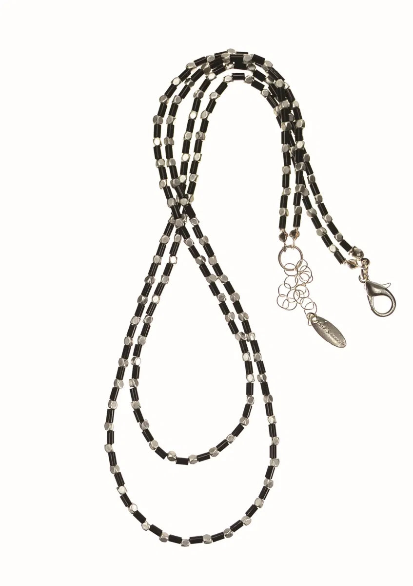 Hot Tomato Worn Silver & Noir Double Layer Chain Necklace features a striking two-row design combining worn silver cube beads...