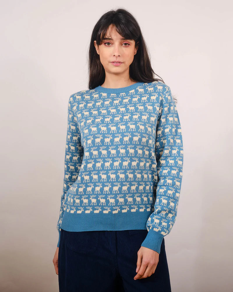 The Basic Moose Sweater in bright blue adds a cheerful pop to any outfit. Featuring charming cuffed sleeves and a...