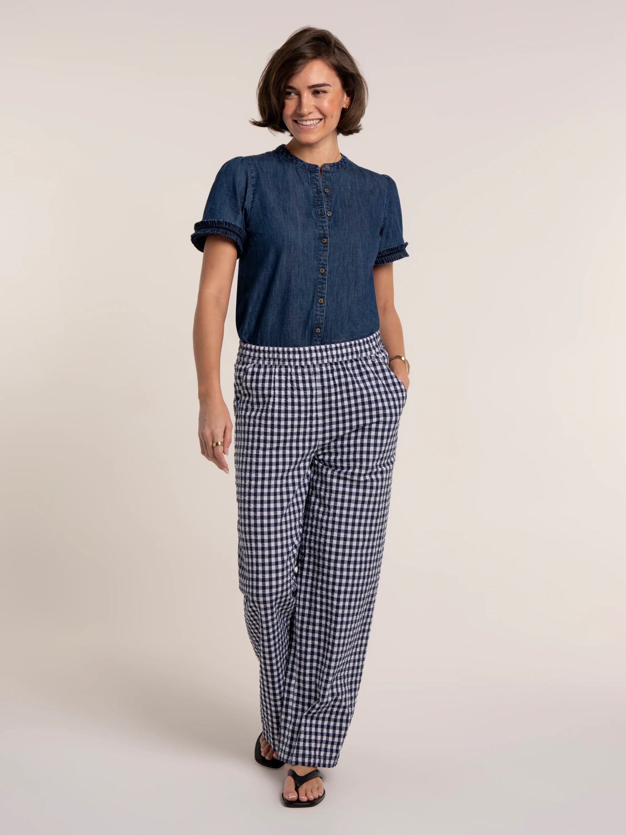 Navy and white gingham brings a classic summer feel to our Bia Blouse. Designed with a relaxed shape, it features...