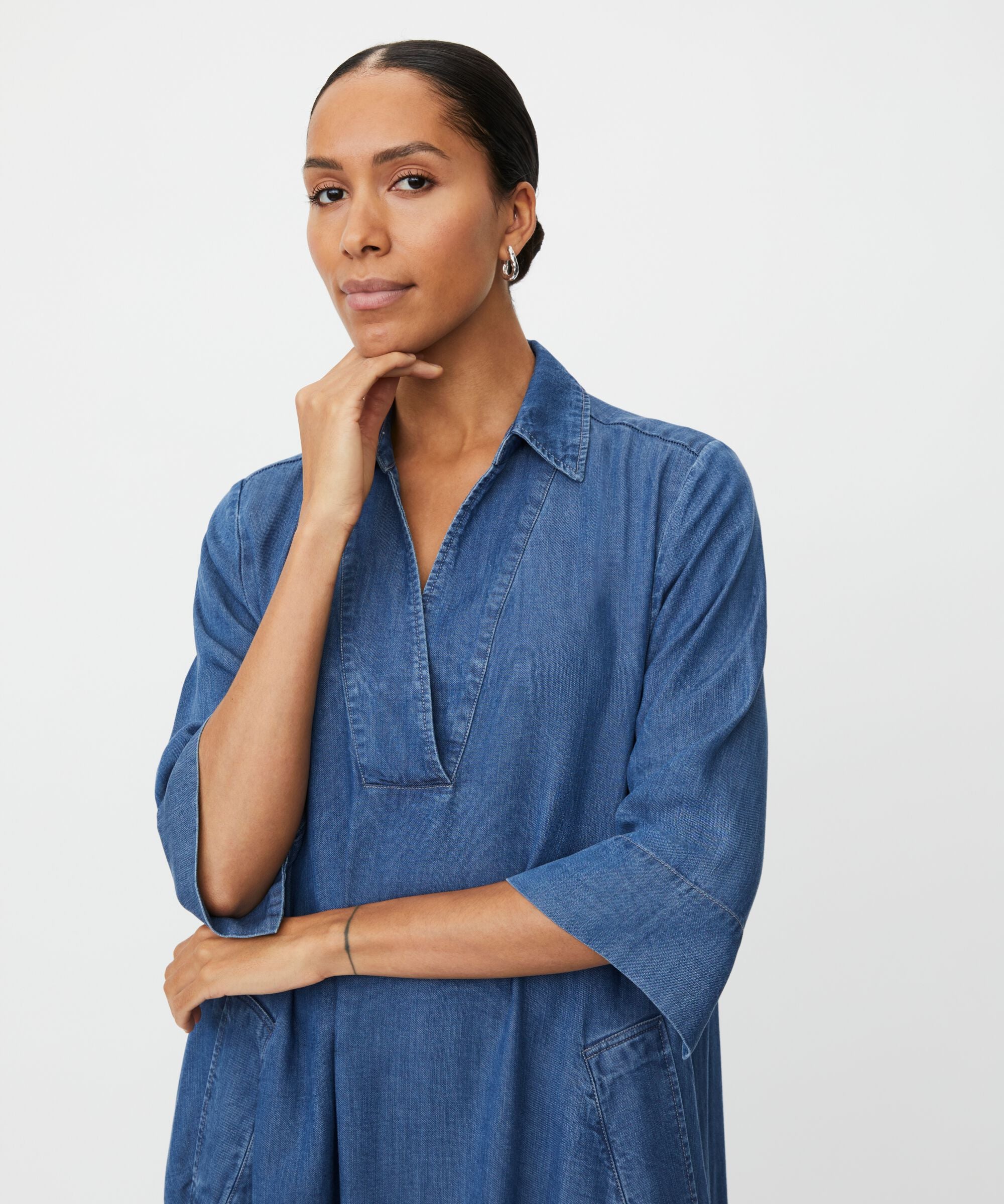 Soft washed denim dress that solves endless styling dilemmas. The relaxed A-shape cut drapes beautifully over the body, while the...