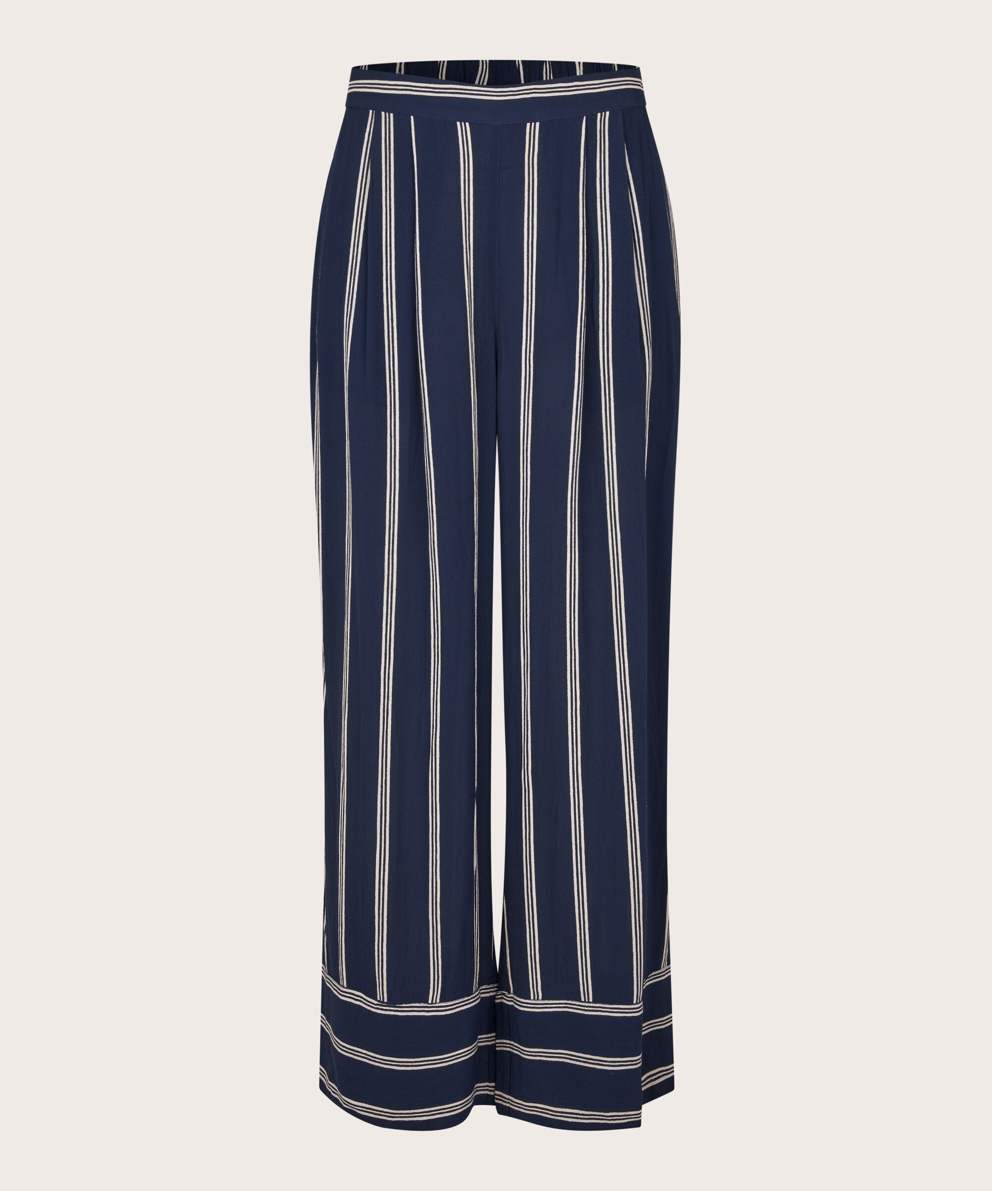 Let beautiful stripes fill your wardrobe. These dark blue viscose trousers with stylish white stripes offer a striking contrast. The...
