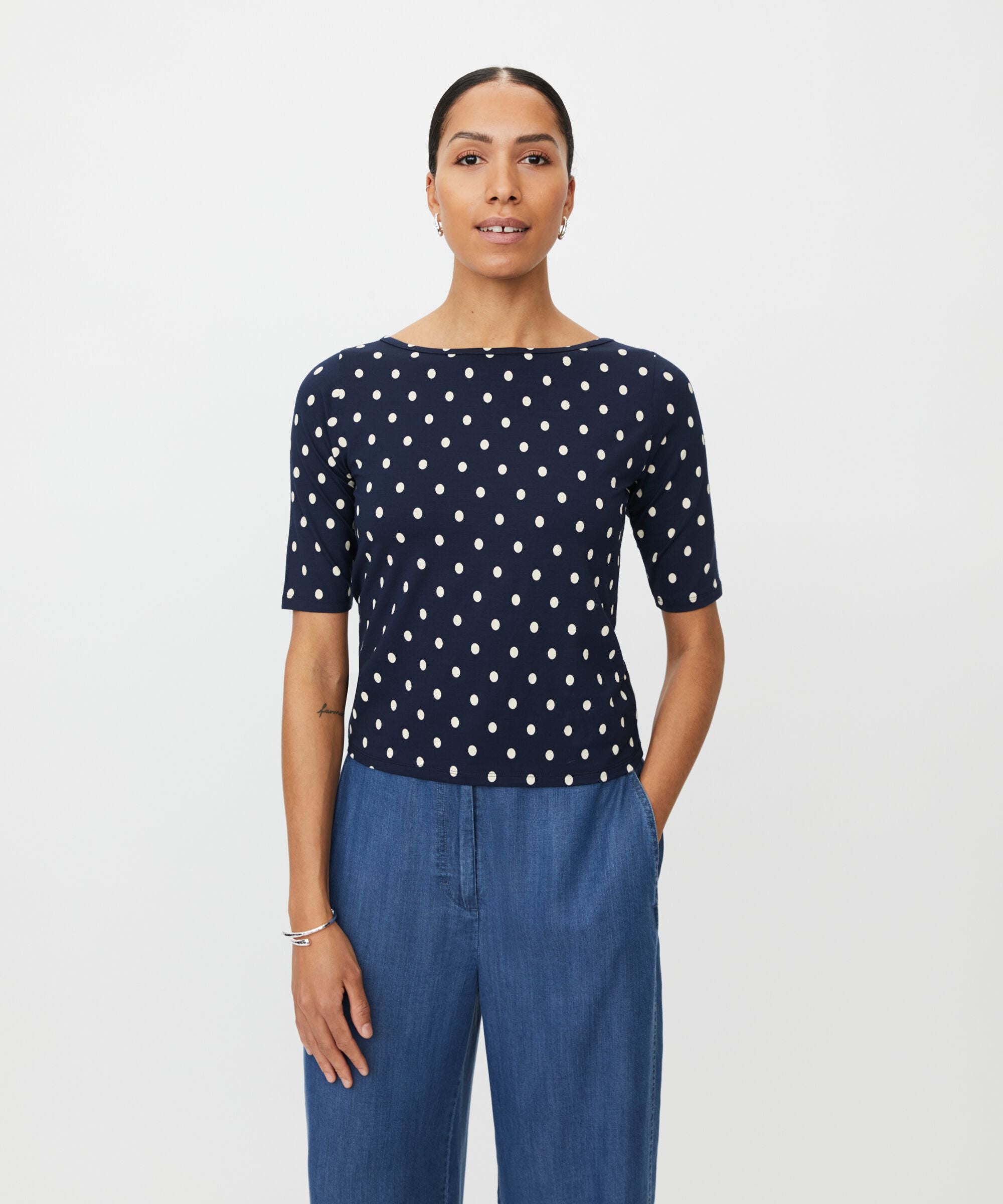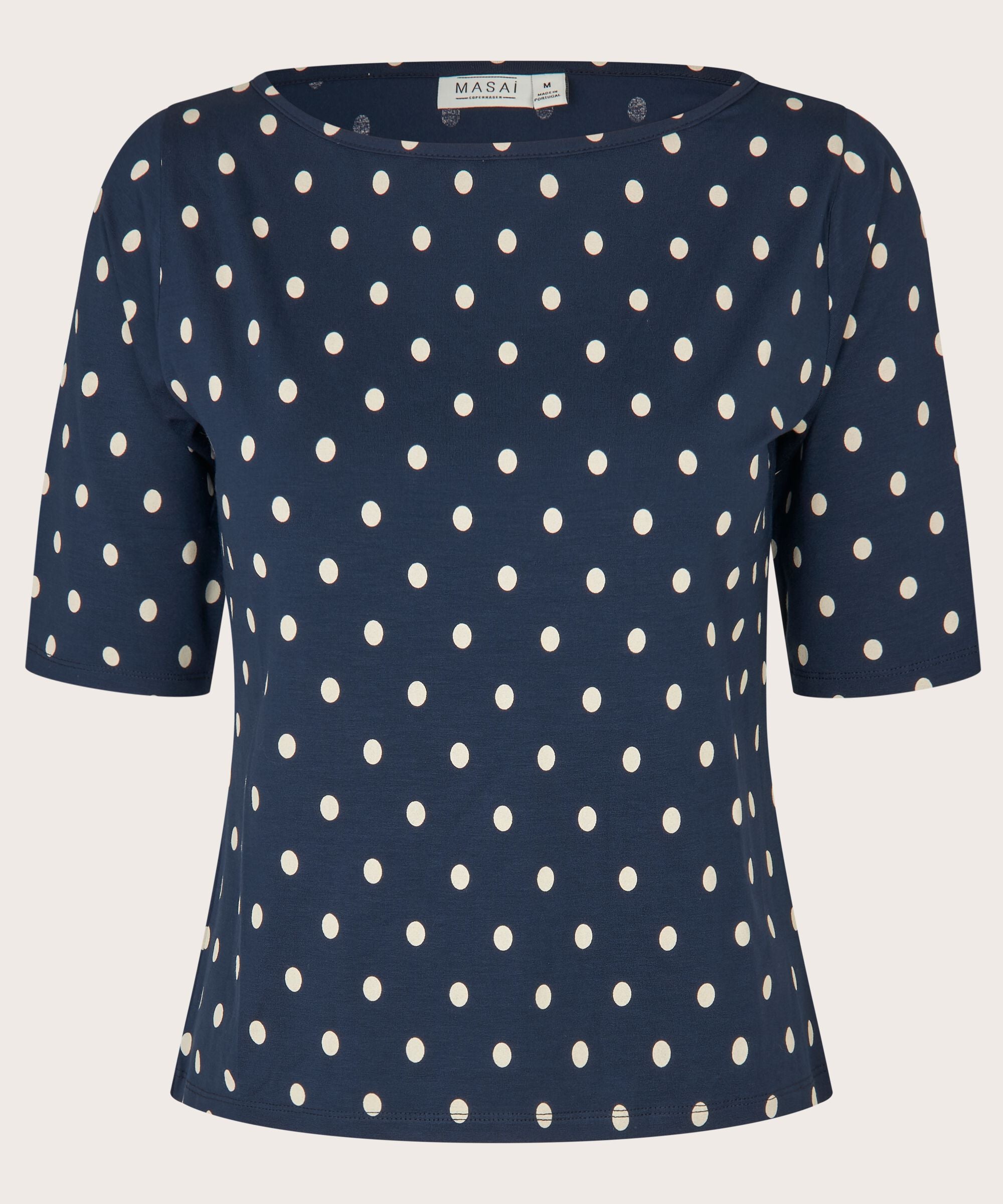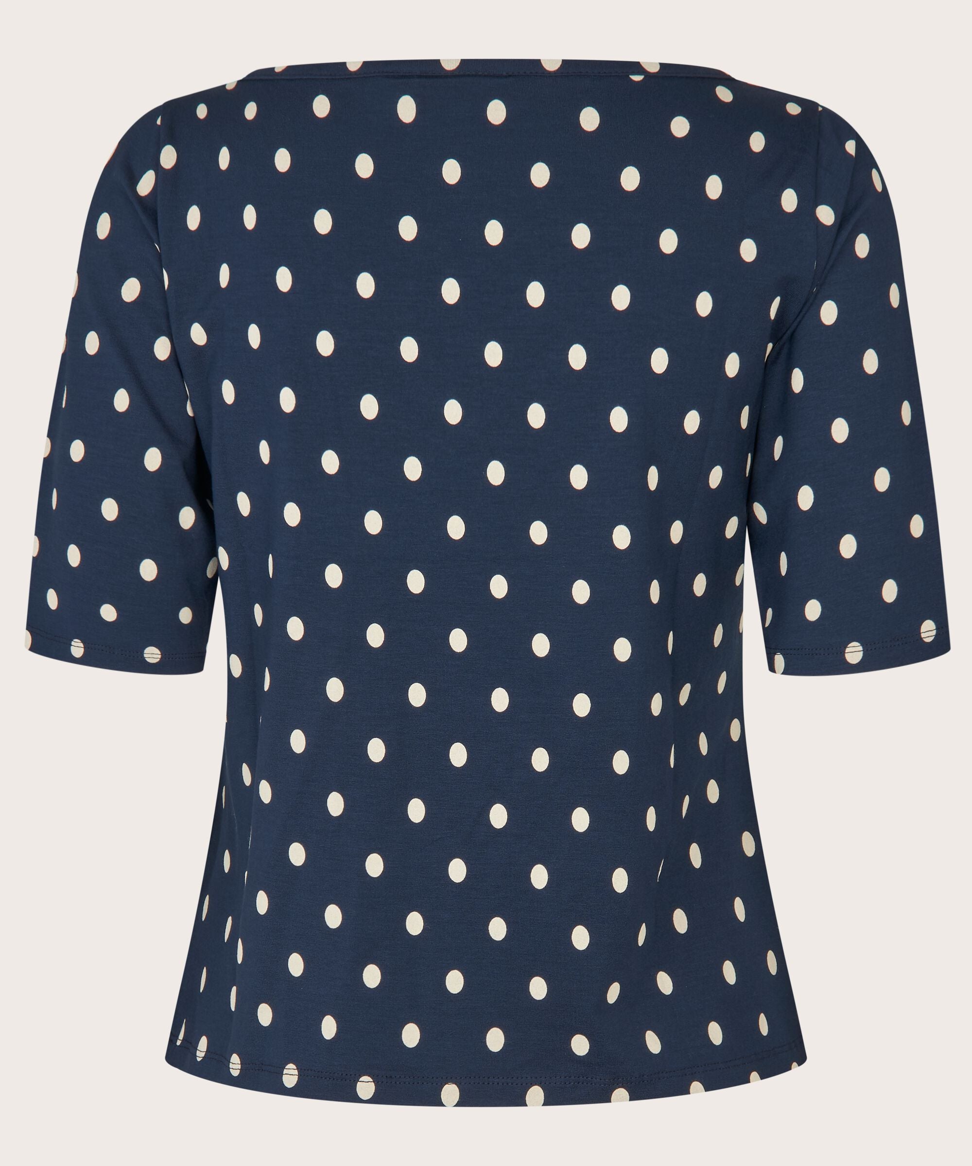 Polka dots are all you need to create an elegant and vibrant look. This dark blue top in soft jersey...