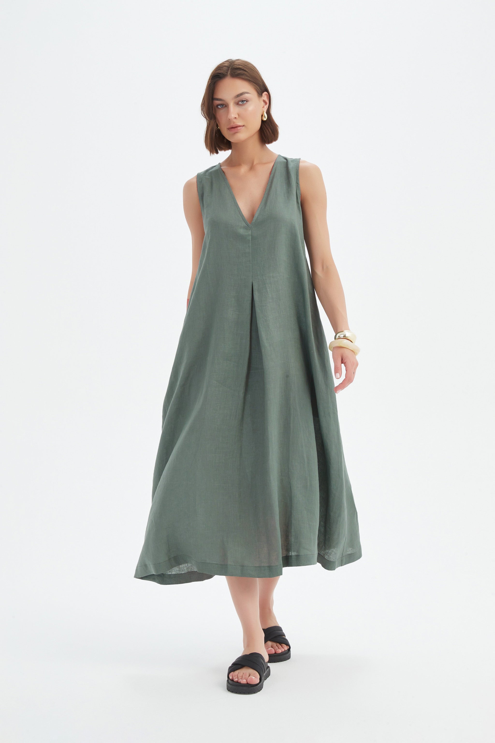 Effortless sophistication meets modern design in this Inverted Pleat Dress. Constructed from 100% French linen, the sleeveless midi silhouette features...