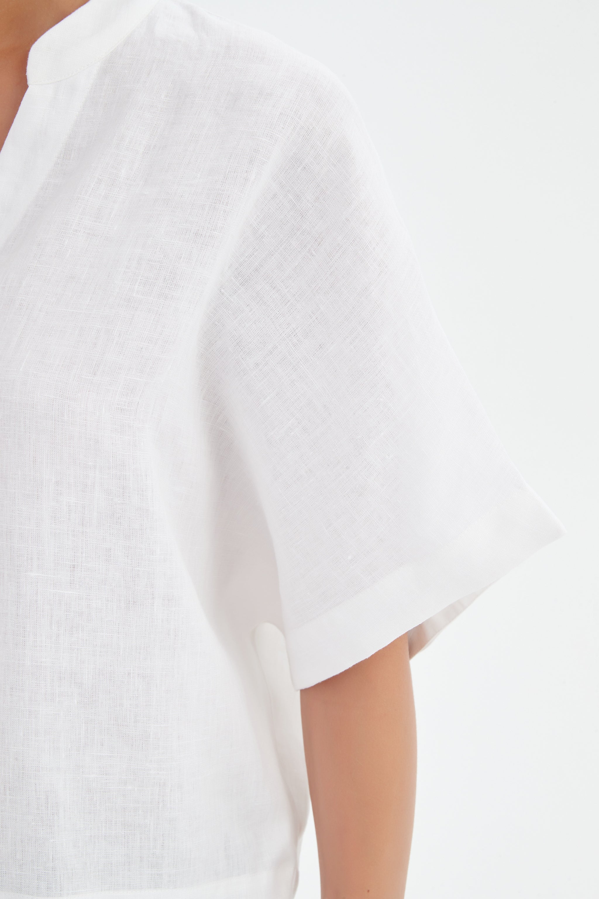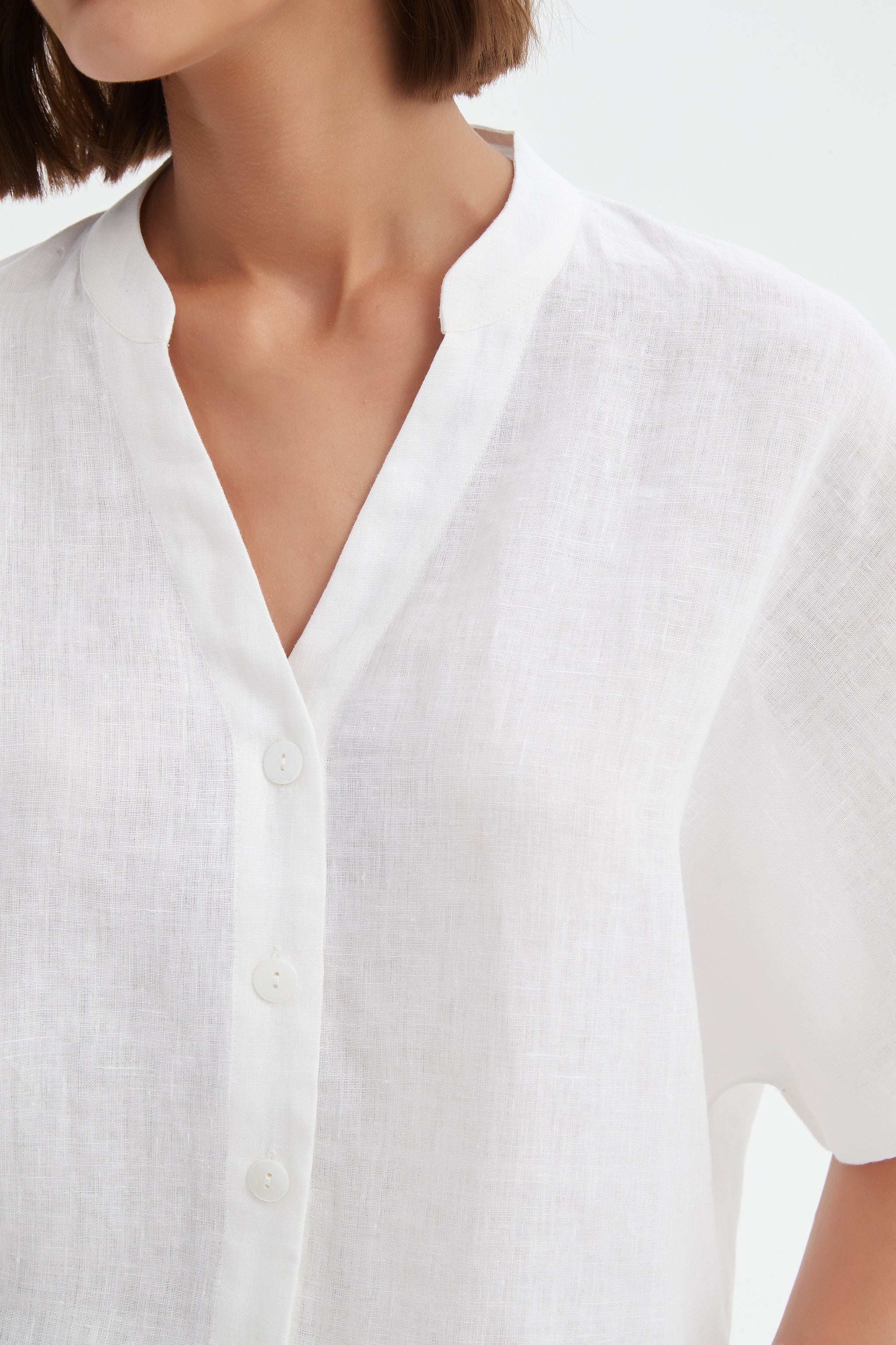 Effortless elegance meets everyday practicality in this contemporary linen shirt. The relaxed boxy cut, notch neckline, and generously proportioned short...