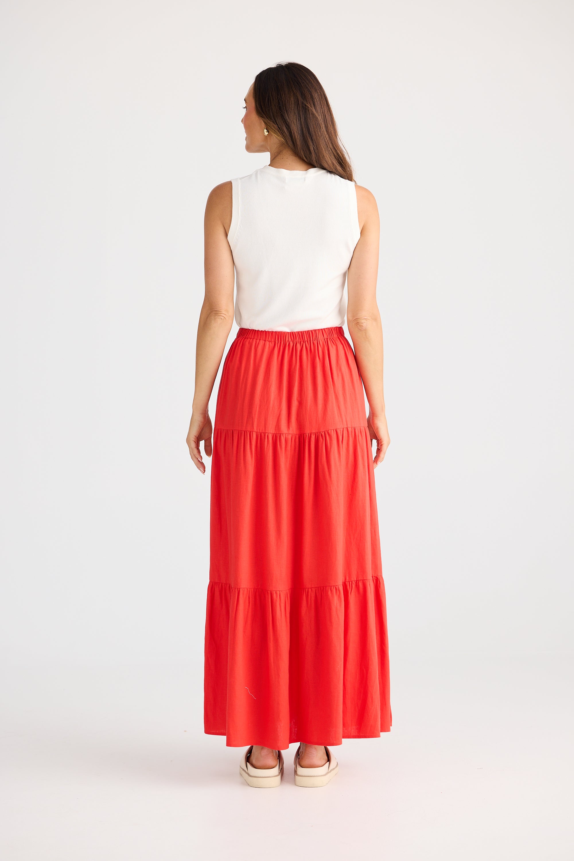 Elevate your wardrobe with this striking poppy red maxi skirt from Brave + True. Featuring a comfortable elasticated waistband and...