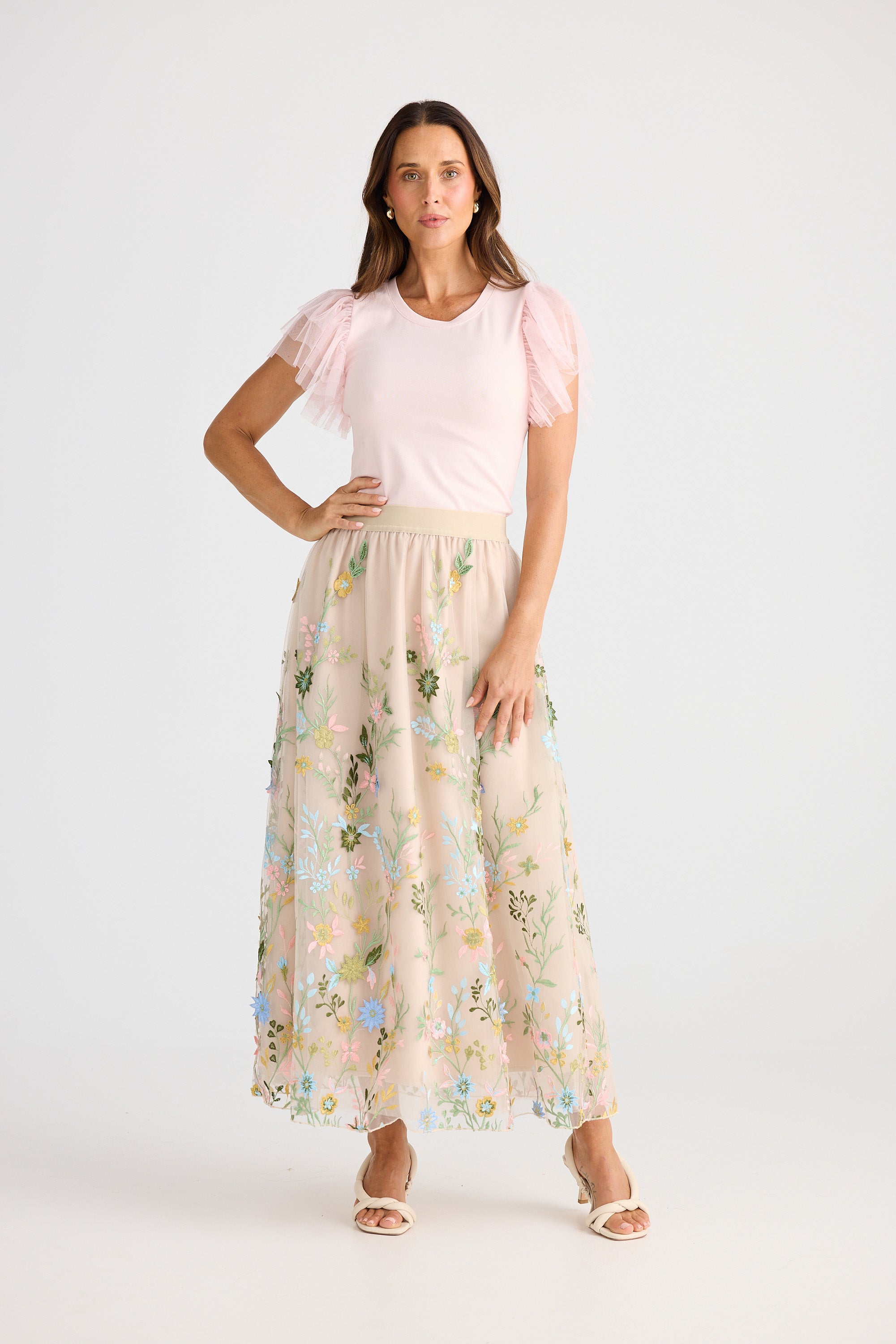 Elevate your summer wardrobe with this stunning embroidered skirt, featuring intricate floral detailing that commands attention. The layered design with...