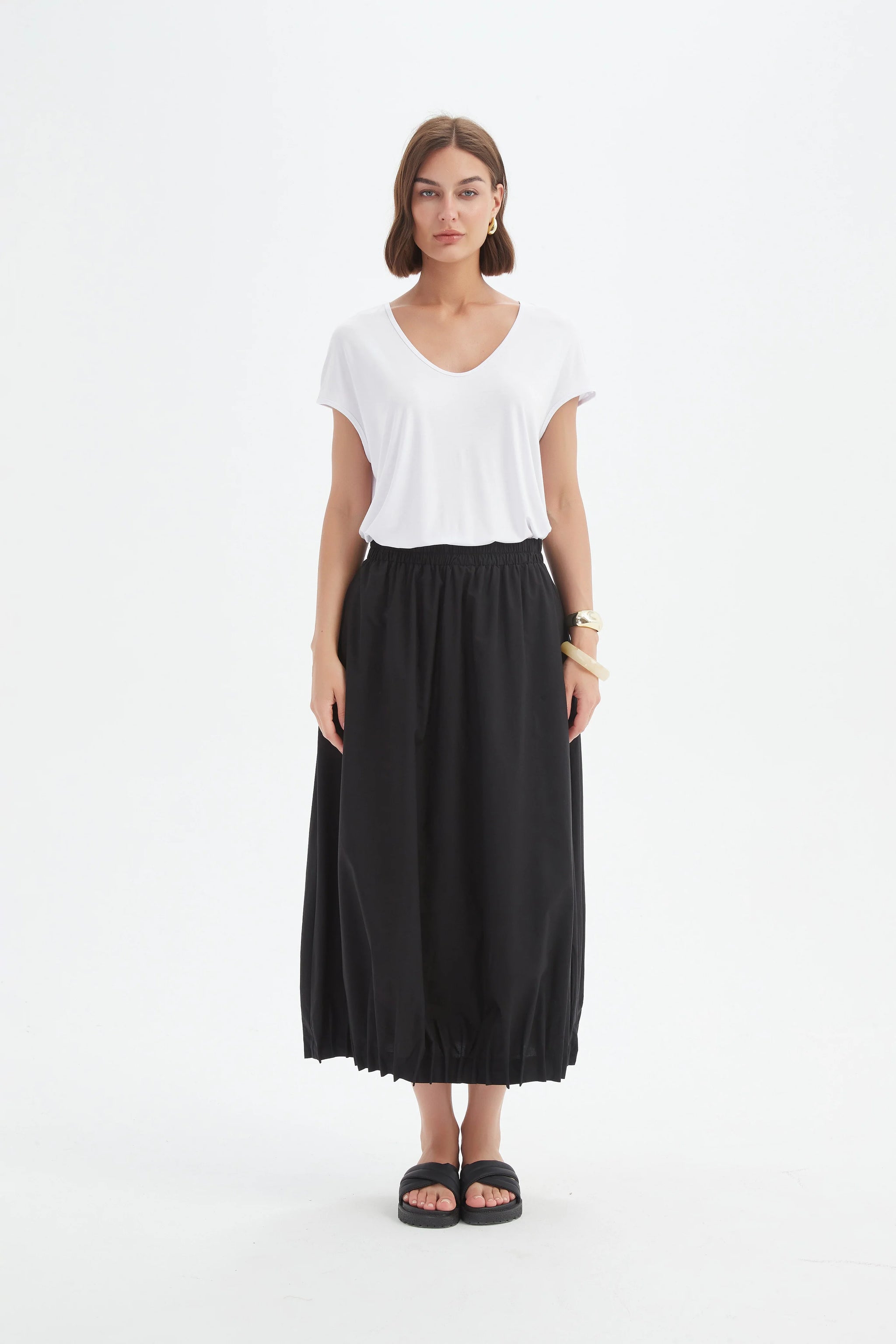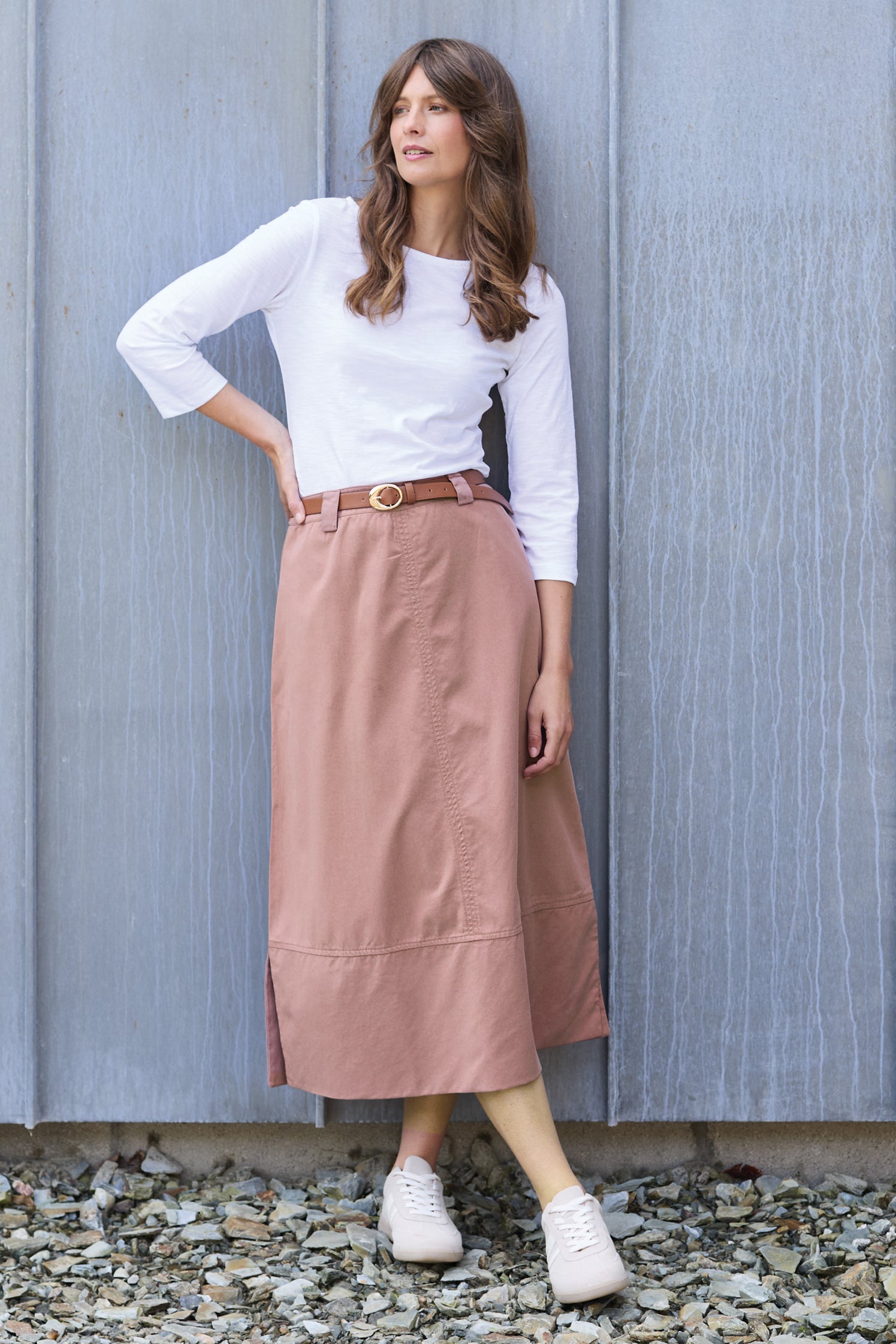 Elevate your everyday wardrobe with this sophisticated midi skirt, expertly crafted from a breathable cotton and lyocell blend that moves...